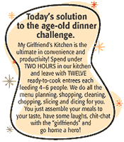 What's for dinner tonight? My Girlfriend's Kitchen solves that problem and our customers leave the mess in our kitchen! Imagine assembling and taking home 12 family-sized, ready-to-cook gourmet entrées without the aggravation of shopping, prep or cleanup. Put them in your fridge and freezer and stop wondering what's for dinner tonight!